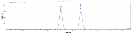 目标物在0.1ppm-2ppm线性良好。取空白鞋材样品加标,样品经过丙酮超声萃取。1ppm加标水平下谱图如下,得到了比较满意的效果。