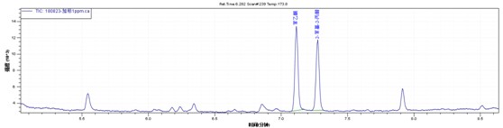 图5.1ppm加标下SIM色谱图1,苯乙酮(Acetophenone) 2, 2-苯基-2-丙醇(2-Phenyl-propan-2-ol)