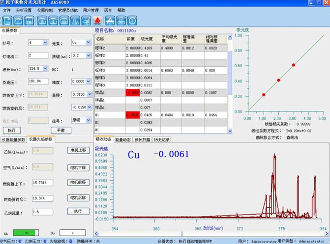 样品测试:于原子吸收光谱仪波长324.7nm处,使用空气-乙炔火焰,以水调零,测量试液的吸光度,减去随同试料的空白试验溶液的吸光度,从工作曲线上查出相应的铜浓度