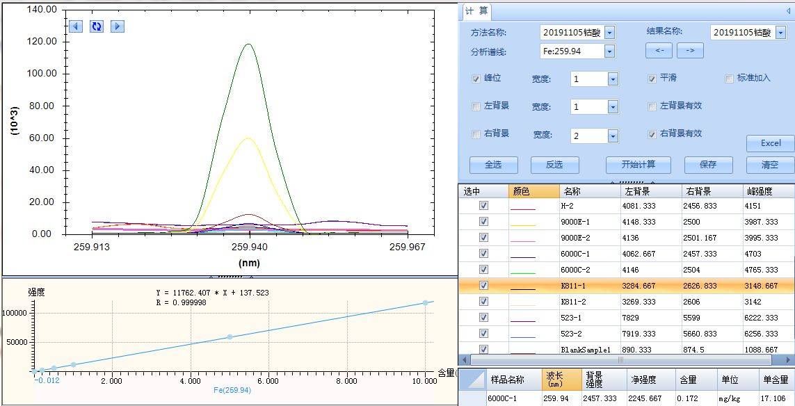 Fe-259.94 | 10.0以内 | Y=8169.577X+118.019 | R=0.999935 | 0.0028 |