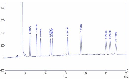 盟议会和理事会于2003年1月通过了RoHS指令,全称是The Restriction of the use of certain Hazardous substances in Electnical and Electronic Equipment,即在电子电气设备中限制使用某些有害物质指令,也称2002/95/EC指令,2005年欧盟又以2005/618/EC决议的形式对2002/95/EC进行了补充,明确了六种有害物质的最大限量值,这六种物质分别为:铅Pb、镉Cd、汞Hg、六价铬Cr6+、,多溴联苯醚PBDE,多溴联苯PBB。世界各国尤其是发达国家,对RoHS指令的出台反响强烈,高度关注;中国是全球制造业大国,也是产品出口大国,出口总量的70%以上涉及到RoHS指令,因此中国政府亦十分重视相关问题,并于2004年出台了《电子信息产品污染防治管理办法》,内容类似RoHS指令,并准备与其同步实施。作为该指令中的多溴联苯醚类有害物质----溴化阻燃剂,被广泛用于多种消费品中,包括电子产品、纺织品、家具、日化、玩具等,这些物质的存在,一方面避免产品起燃,确保人类生活安全,然而另一方面,由于该类物质在生产和回收中多有残留,也已影响到人类的生活健康,这也是该指令颁布的初衷。针对该指令中多溴联苯醚溴系阻燃剂的测定,国家公认的检测方法有GC/MS、GC/FID、GC/ECD、HPLC/MS/MS、 HPLC/UV以及红外光谱法等,然而GC/MS、HPLC/MS/MS仪器价格昂贵,对人员的专业素质要求高,对用户来说,普及率不高,尤其是中小型企业相对难度加大,而GC/FID、GC/ECD、HPLC/UV均只对部分多溴联苯醚进行分离。本文在HPLC/UV的基础上进一步优化,提出了一种方法简便、快速、准确、灵敏度高、适应性好、回收率高,可用于工厂质量控制和检验机构样品检验的方法。